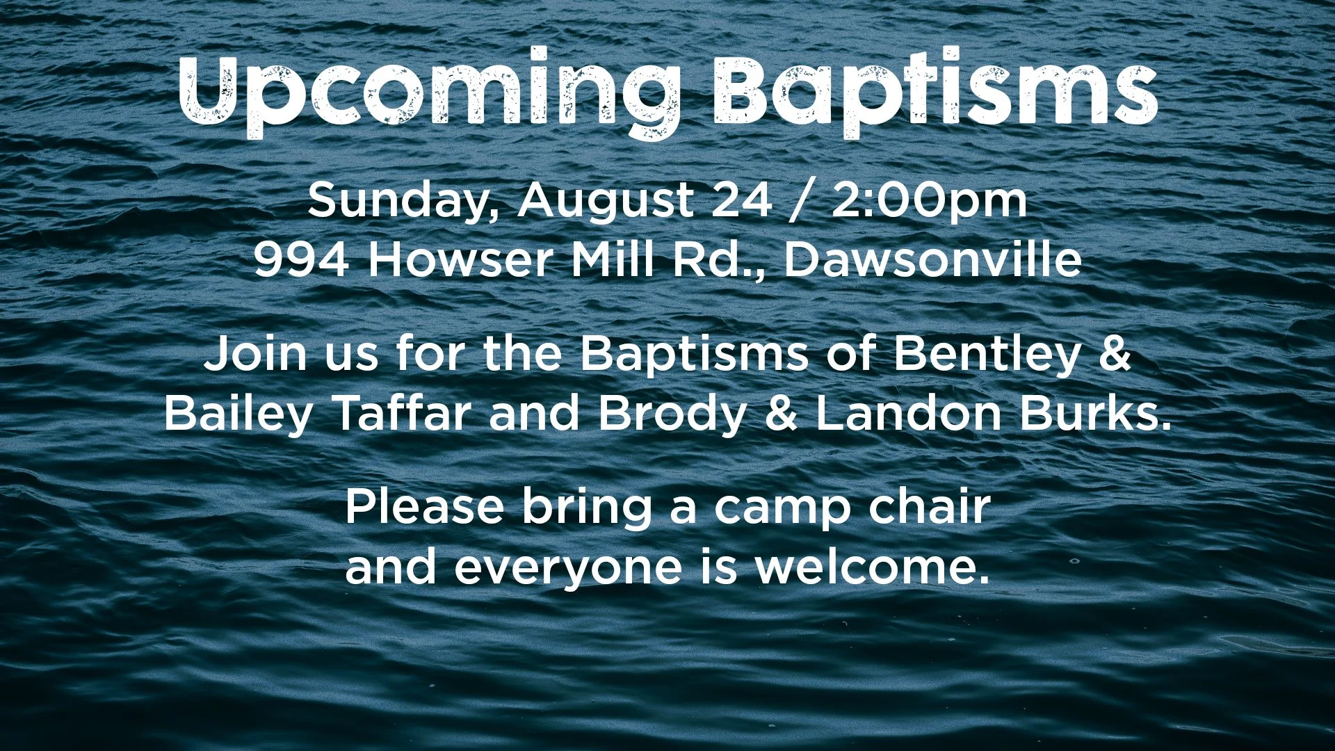 Join us for the Baptisms of Bentley & Bailey Taffar and Brody & Landon Burks. Please bring a camp chair and everyone is welcome.