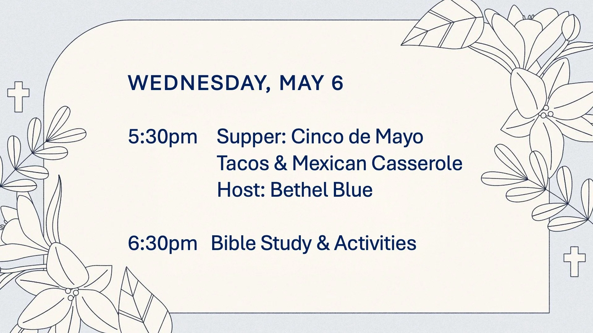 5:30pm - Supper: Cinco de Mayo / Tacos & Mexican Casserole