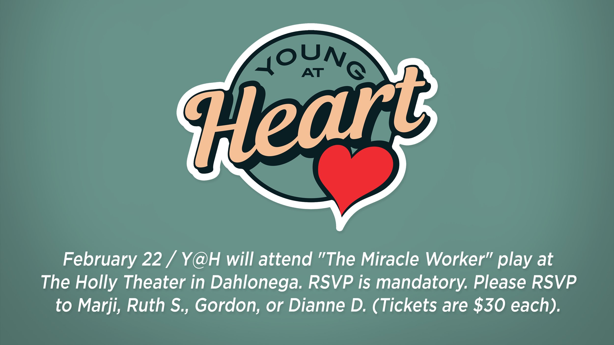 Back to All Events Young at Heart February Outing Sunday, February 22, 2026 12:00 PM 5:00 PM Bethel Church 100 Lumpkin Camp Ground Road South Dawsonville, GA, 30534 United States (map) Google Calendar ICS February 22 / Y@H will attend "The Miracle Worker" play at The Holly Theater in Dahlonega. RSVP is mandatory. Please RSVP to Marji, Ruth S., Gordon, or Dianne D. (Tickets are $30 each).